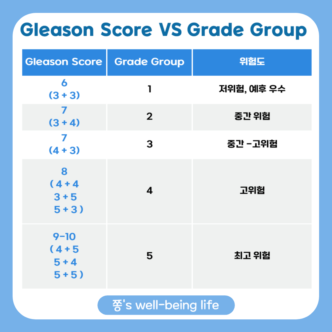 Grade Group의 숫자가 낮을수록 저위험, 숫자가 높을수록 종양의 악성도, 성장 가능성, 치료 필요성이 커진다고 해석하시면 됩니다.