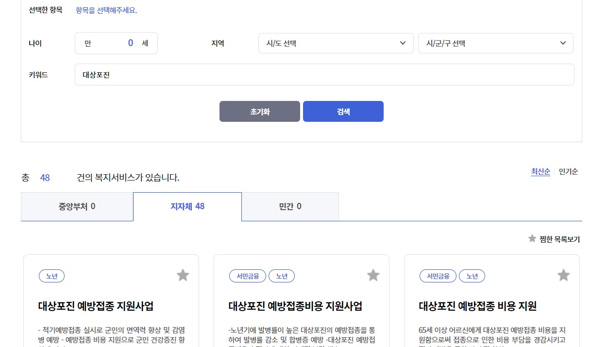 지역 설정을 같이 하고 대상포진을 검색하면 원하는 지역의 무료 예방접종 사업만 확인할 수 있습니다.