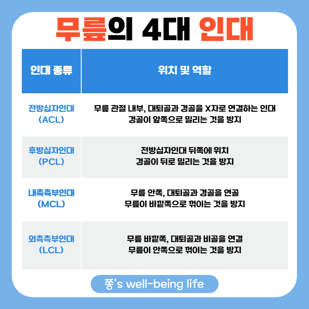 무릎에는 대표적으로 4개의 주요 인대가 있습니다.