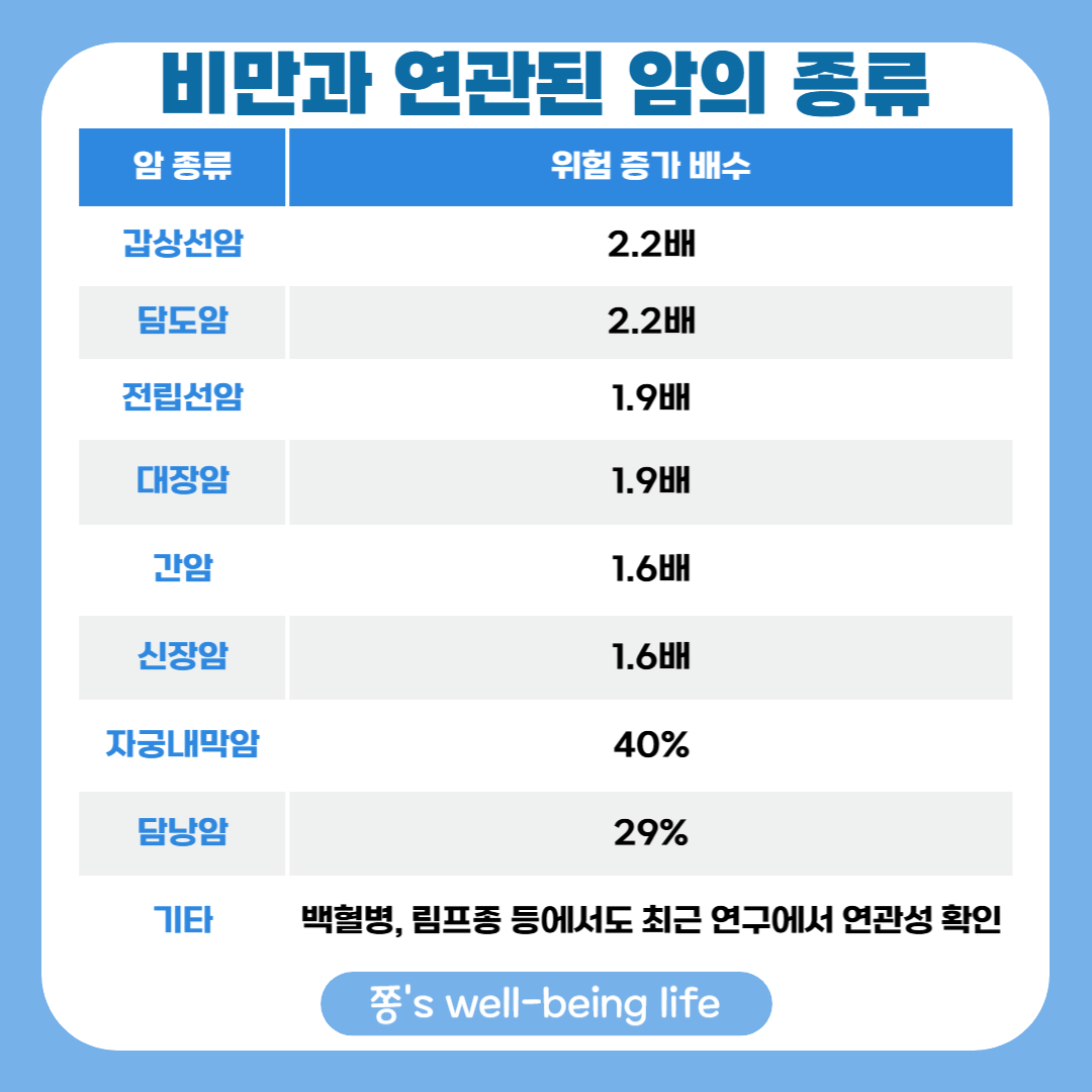 - 보건복지부와 비만과 암 발생에 대해 연구한 국내 연구에 따르면, 비만은 대장암(1.9배), 간암(1.6배), 담도암(2.2배), 전립선암(1.9배), 신장암(1.6배), 갑상선암(2.2배), 폐의 소세포암(1.5배) 등 다양한 종류의 암 발생 위험을 높입니다.