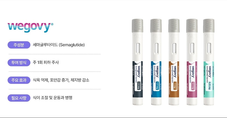 위고비의 주성분은 '세마글루타이드(Semaglutide)'로, 식욕 억제 및 포만감을 증가시키는 호르몬 GLP-1(Glucagon-Like Peptide-1)을 모방하여 식욕을 감소시켜 줍니다.