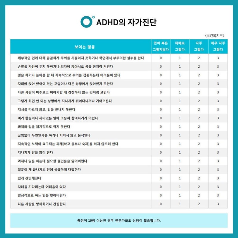 위의 자가진단 테스트에서 19점 이상이 나온다면 전문가와의 상담을 통해 ADHD 유무를 확인해 볼 필요가 있습니다.