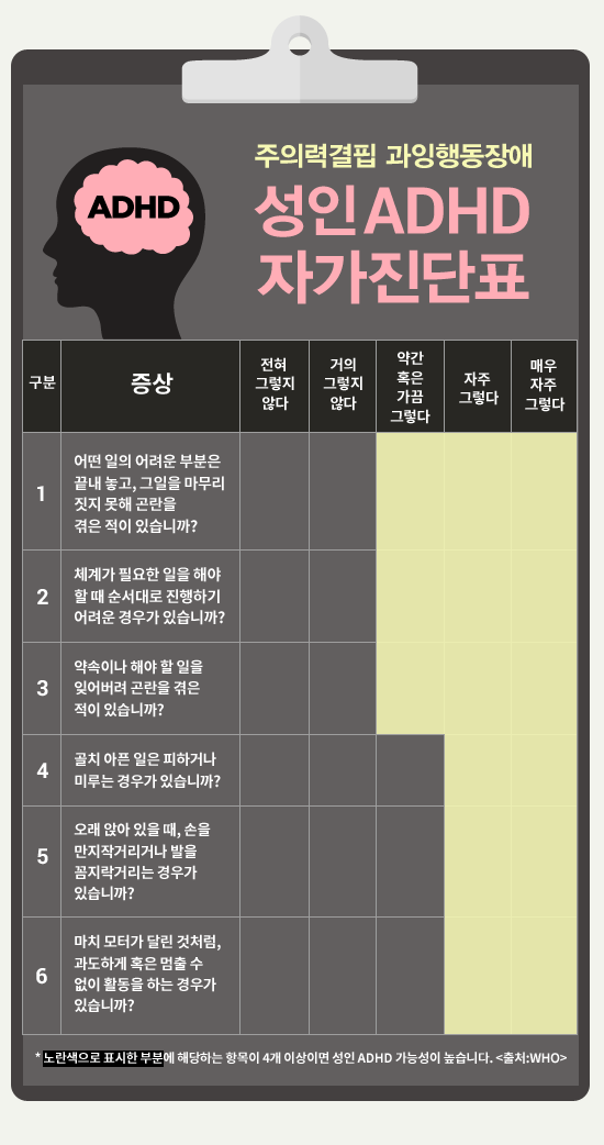 성인 ADHD의 경우 위의 자가진단 테스트 표 중 노란색으로 표시한 영역에 해당하는 항목이 4개 이상일 때, 전문가와의 상담을 통해 ADHD 유무를 확인해 볼 필요가 있습니다.